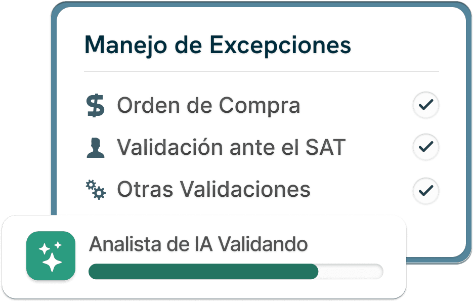 Deja que nuestro Agente de IA valide tus facturas contra órdenes de compra o datos fiscales, y gestione las excepciones directamente con los proveedores.