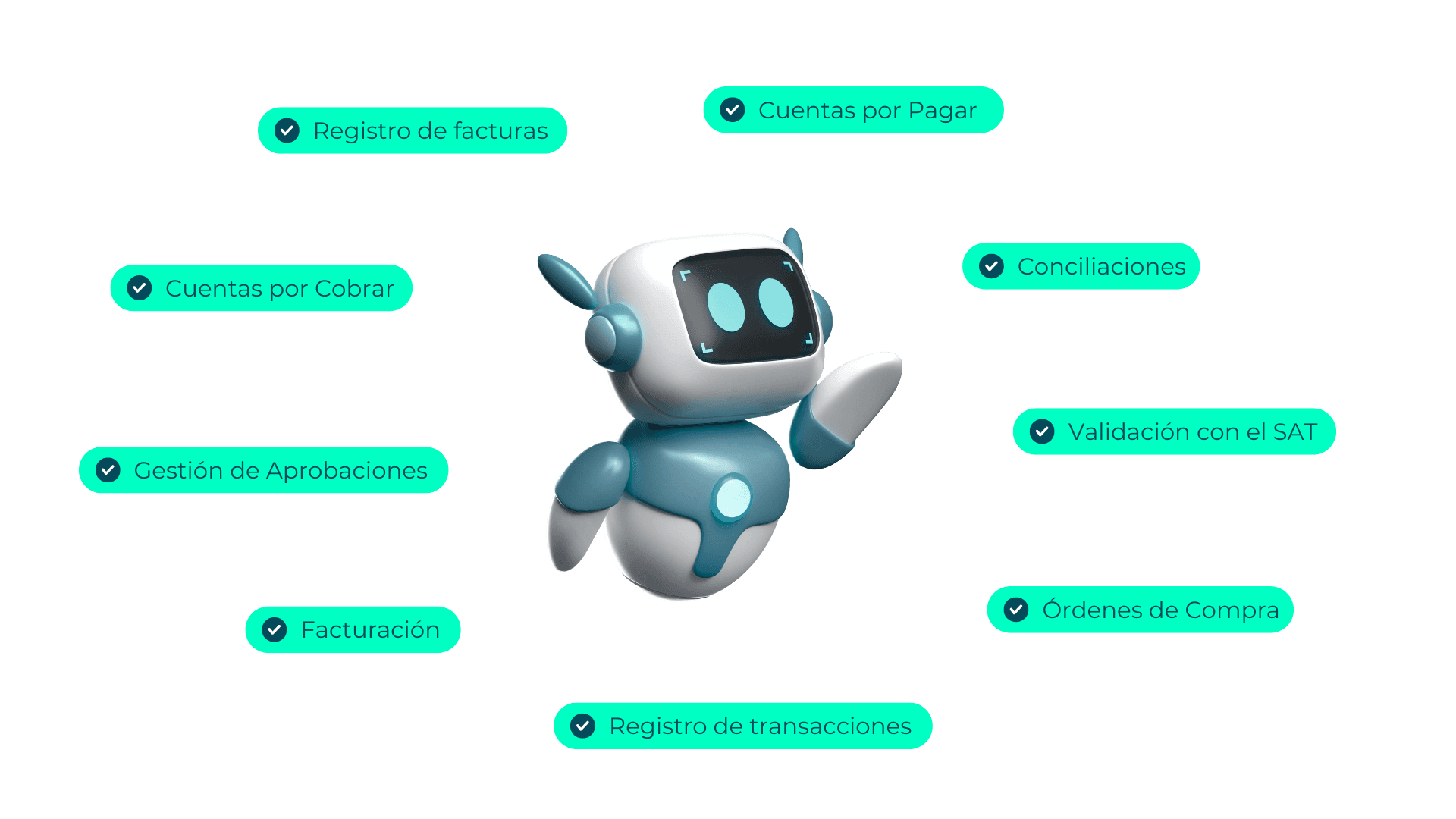 Agentes de IA que ejecutan tareas operativas en tus procesos (CxP, CxC, Compras, Ingresos)