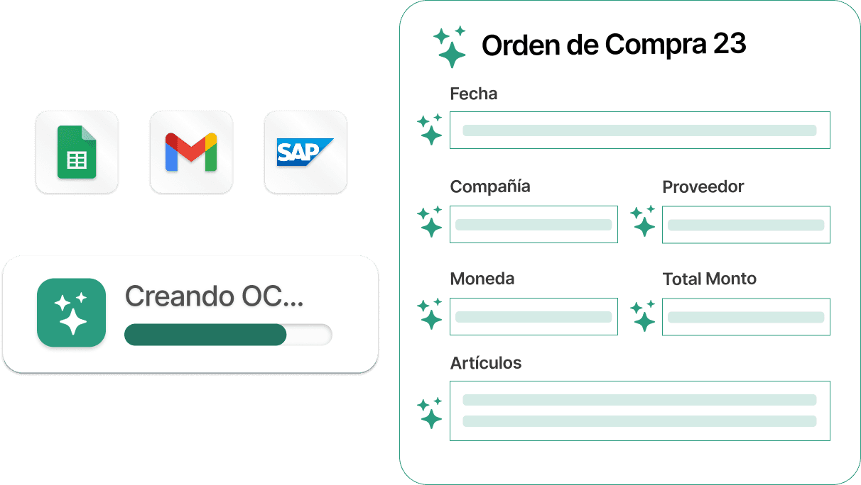 Crea órdenes de compra en segundos a partir de solicitudes, correos o plantillas, listas para enviar al proveedor y registrar en tu ERP.